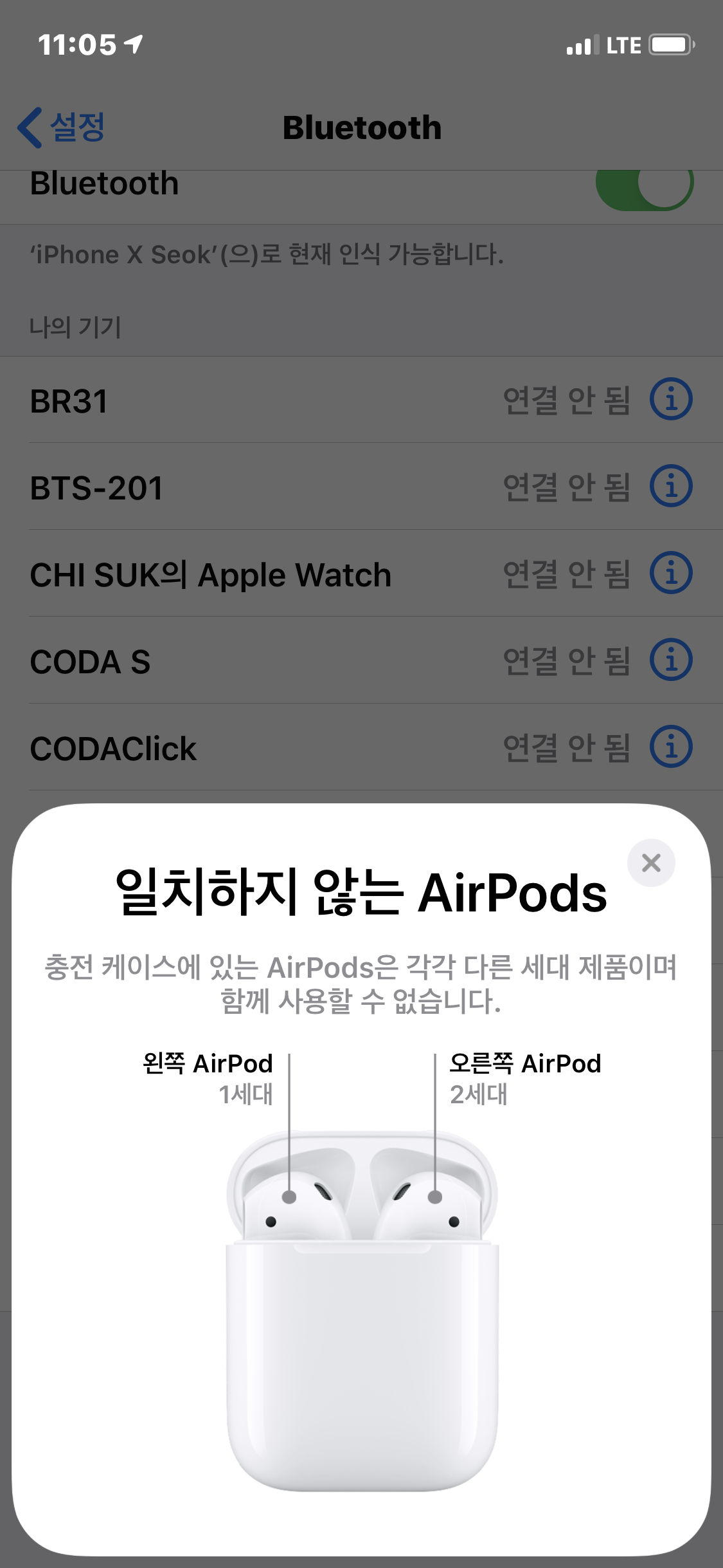 결론 에어팟(Airpods) 1,2 세대는 세대가 다르더라도 사용은 가능하지만 동시 사용은 안된다.